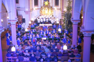 Blasorchester und Chor entführten dann die Besucher gemeinsam mit dem grandiosen Medley “Christmas on Broadway” nach Amerika. Es begann mit “It’s beginning to look like Christmas”, gefolgt von “Pine Cones and Holly Berries”, dann “Toyland”, bekannt aus den Canta-Claus-Filmen, dann “March of the toys”, dem Walzer “My favorite things”, “We need a little Christmas” und dem letzten Lied “God bless us everyone”. Dieses große Werk war zweifellos ein weiterer musikalischer Höhepunkt dieses Konzertes. Chor und Orchester harmonierten prächtig. Nach dem der letzte Ton verklungen war, war es zunächst einen Sekundenbruchteil ganz still. Dann jedoch brandete der Beifall langanhaltend durch das Gotteshaus. Das war so ein ganz besonderer Moment, weshalb viele Besucher aus nah und fern bereits seit Jahren regelmäßig zum Weihnachtskonzert nach Fischenich kommen.