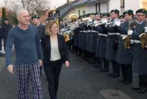 Mit klingendem Spiel zogen der Musikzug und das Tambourcorps der des Musikkorps unter Leitung von Oberstleutnant Christoph Schreibling in Marschformation vor sein Haus in der Lehnengasse. Nach einem zünftigen Marsch schritt Gerd Außem zu den Klängen des Präsentiermarsches protokollarisch korrekt dann mit seiner Frau Katrin die Front ab. Weil Gerd von diesem Auftritt seiner Kameraden zu seinem Abschied “überrascht” war, war er dabei in Räuberzivil und auf Puschen unterwegs.