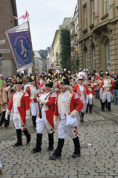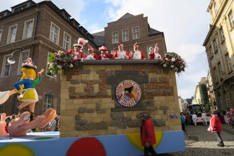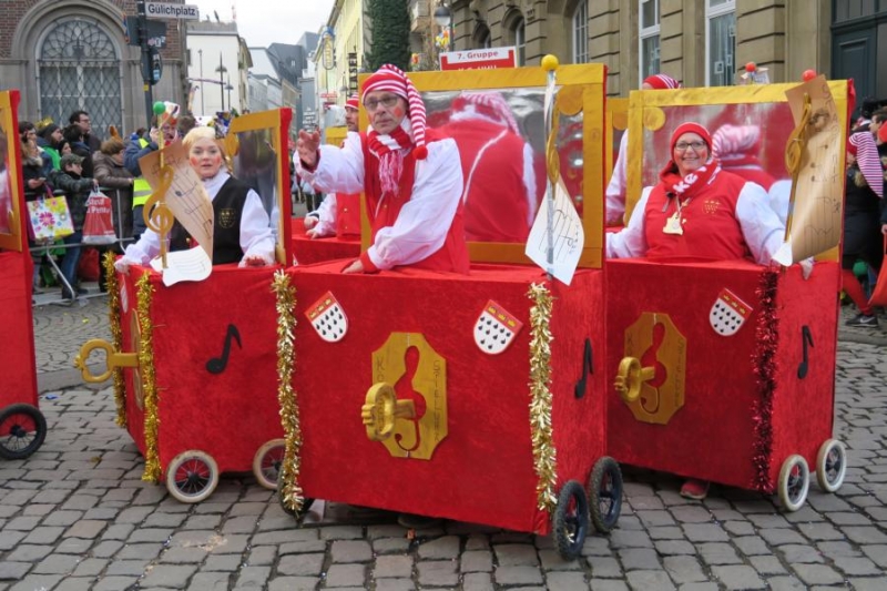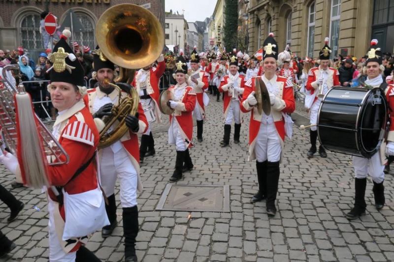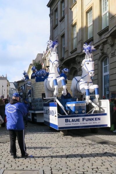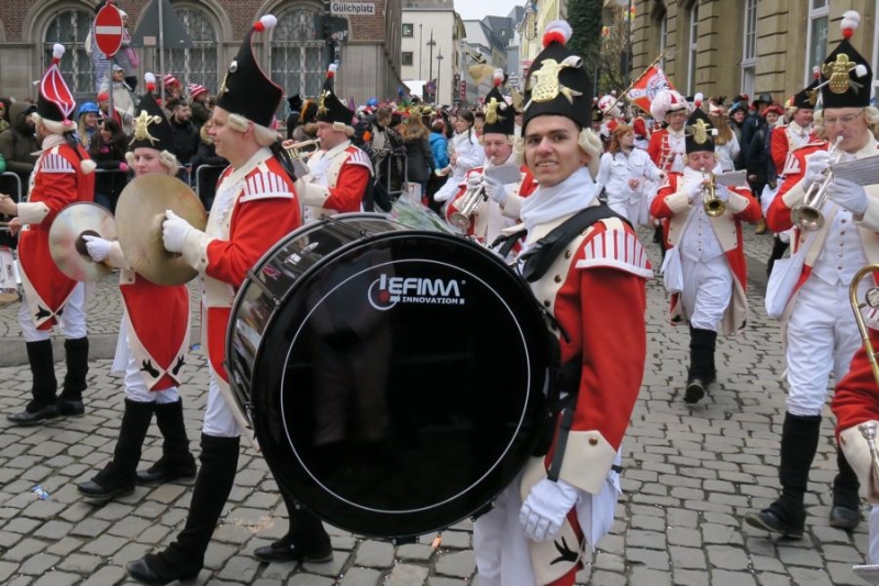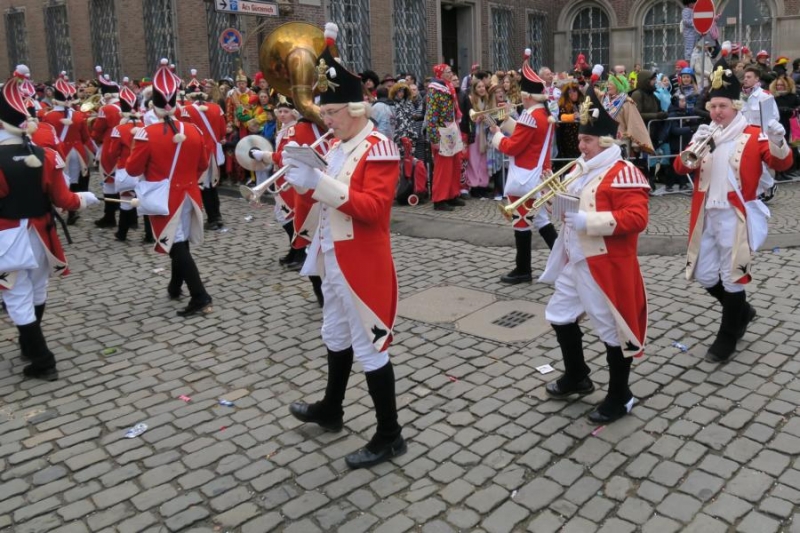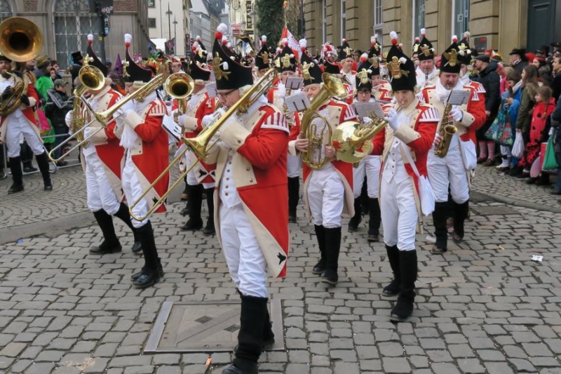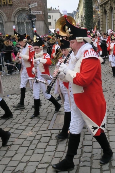 Zum erstenmal nahm unser Blasorchester am Kölner Rosenmontagszug teil. Wir stellten uns am Ubierring auf. Die riesengroße Truppe der Roten Funken marschierte als 5. Gruppe gegen 10.30 Uhr los. Wir gingen nach dem 2. Bagagewagen, vor den Fahnen der Roten Funken und dem 1. Knubbel. Glücklich, aber auch geschafft, spielten wir das letzte Karnevalslied um 02.15 Uhr. Ziemlich genau 3 Stunden und 45 Minuten lang waren wir durch die Kölner Innenstadt, vorbei am Dom, unterwegs – im schönsten Sonnenschein und getragen von den Abertausenden, meist toll kostümierten Jecken.