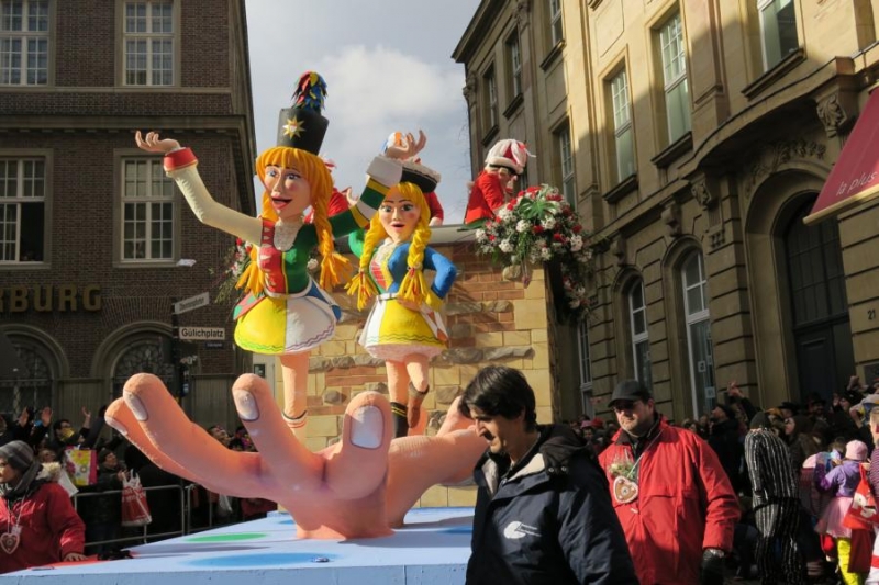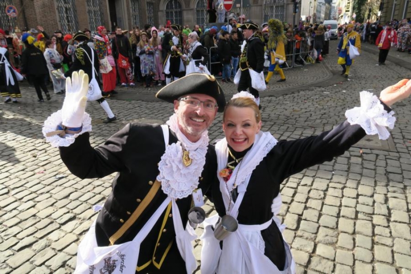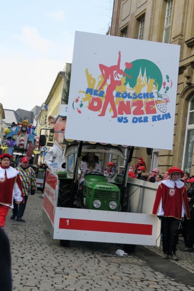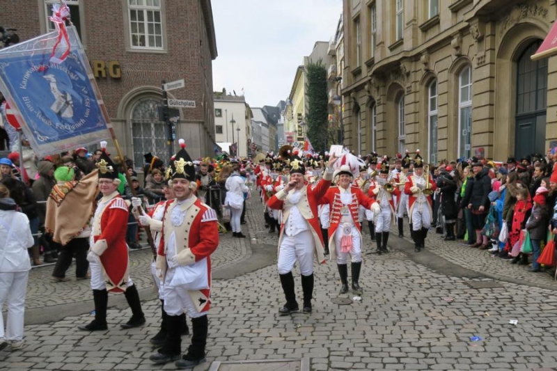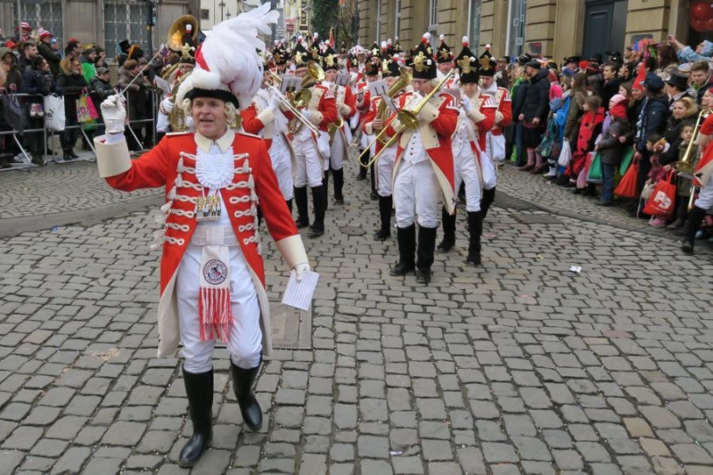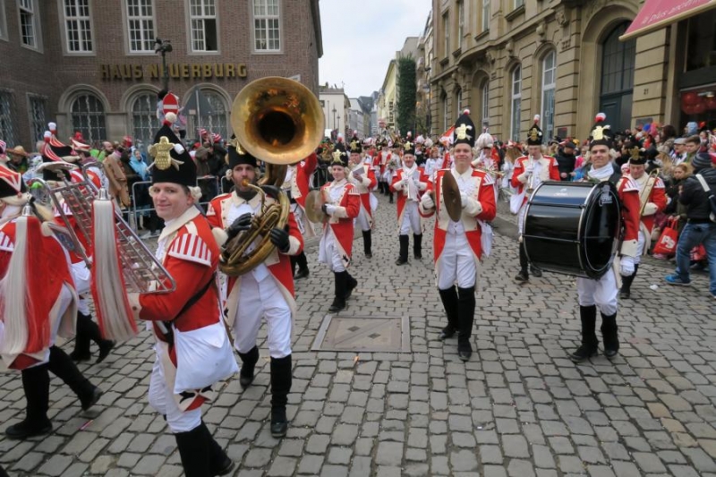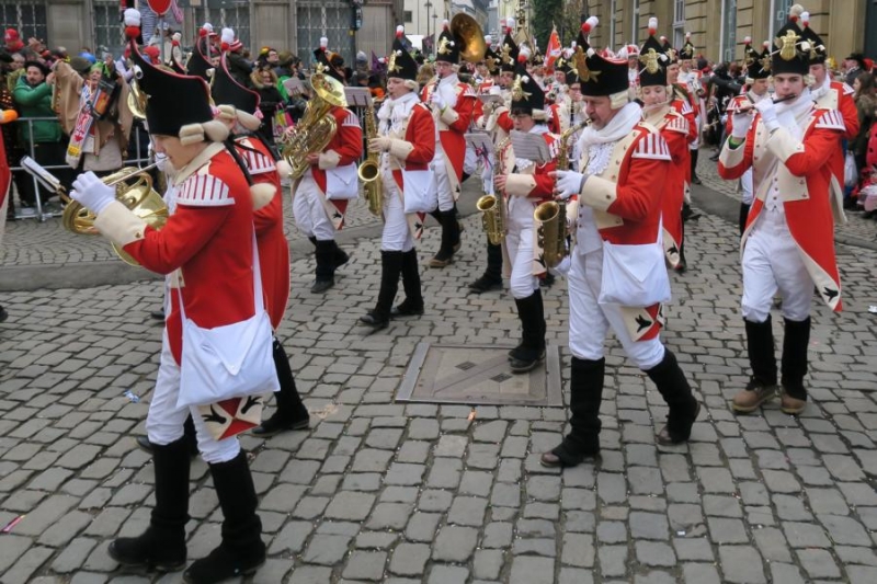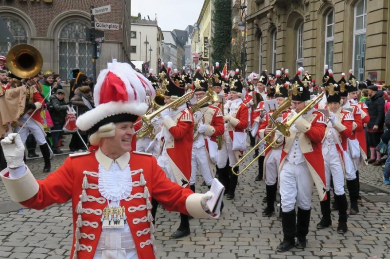 Zum erstenmal nahm unser Blasorchester am Kölner Rosenmontagszug teil. Wir stellten uns am Ubierring auf. Die riesengroße Truppe der Roten Funken marschierte als 5. Gruppe gegen 10.30 Uhr los. Wir gingen nach dem 2. Bagagewagen, vor den Fahnen der Roten Funken und dem 1. Knubbel. Glücklich, aber auch geschafft, spielten wir das letzte Karnevalslied um 02.15 Uhr. Ziemlich genau 3 Stunden und 45 Minuten lang waren wir durch die Kölner Innenstadt, vorbei am Dom, unterwegs – im schönsten Sonnenschein und getragen von den Abertausenden, meist toll kostümierten Jecken.