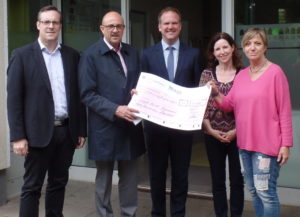Michael Maier überreicht einen Scheck über 1.500 € an Bettina Engel vom Familienbüro “Am Gustav” in Hürth-Efferen
