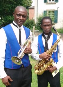 Erstmals beim Schützenfest in Fischenich spielten Hauptmann Allie Brima Vengar (Trompete) und Oberstabsgefreiter Michael Hugnes (Saxophon) in den blau-weißen Uniformen unseres Blasorchesters. Die beiden Gastmusiker kommen beide aus dem westafrikanischen Staat Sierra Leone und lernen zur Zeit beim Bundessprachenamt in Hermülheim die deutsche Sprache, bevor sie zum Ausbildungsmusikkorps der Bundeswehr nach Hilden wechseln. Bis dahin proben und spielen sie bei unserem Blasorchester mit.
