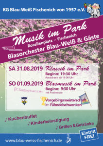 Die KG Blau-Weiß Fischenich lädt ganz herzlich zum in diesem Jahr wieder zweitägigen Musik im Park auf dem Rosellenplatz ein. Am Samstagabend veranstaltet unser Blasorchster ab 19:30 Uhr eine musikalische Reise durch die Operetten-, Musical- und Filmwelt, gepaart mit Abstechern in die populäre Unterhaltungsmusik, aber auch der ein oder andere Marsch wird natürlich nicht fehlen. Der Sonntag beginnt um 9:30 Uhr mit der Festmesse auf dem Rosellenplatz, anschließend läutet unser Nachwuchs mit dem Orchester ‘Die Auftakter’ den weltlichen Teil des Sonntags ein. Danach führen unser Blasorchester und die ‘Musikfreunde Roisdorf’ die Reise durch die vielfältige Welt der Blasmusik fort. In diesem musikalischen Rahmen freuen wir uns den Junggesellenverein Fischenich bei uns begrüßen zu dürfen. Als Titelverteidiger veranstalten sie im Laufe des Sonntags die Vorgebirgsmeisterschaft im Fähndelschwenken bei uns auf dem Rosellenplatz. Für das leibliche Wohl an den beiden Festtagen wird wie immer bestens gesorgt sein.