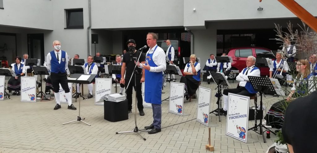 Das war der erste offizielle Auftritt unseres Blasorchester seit Karneval. Damit hat die lange Coronapause ein Ende, wenn auch mit Einschränkungen, wie das Abstand halten der Musiker und zusätzlich weiße Coronadeckel an allen Blasinstrumenten, um so Ansteckungsgefahren zu minimieren.