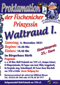 Nach dieser ungewöhnlichen Session 2020/21 richten wir voller Hoffnung den Blick auf das, was kommt – und das ist die nächste Session. Zum 65-jährigen Bestehen unserer Gesellschaft im Jubiläumsjahr 2022 wird Prinzessin Waltraud I. (Waltraud Meyer) unseren Verein und unser schönes Fischenich repräsentieren. Proklamiert wird unsere Prinzessin am 6. November 2021 im Römersaal des Bürgerhauses Hürth. Die Veranstaltung beginnt bereits um 15.30h (Einlass: 14.30h).