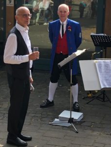 Nach der Messe mit Dankesreden und Übergabe von Geschenken gab es vor der Kirche einen Sektempfang. Dazu spielte unser Blasorchester in großer Besetzung unter Leitung von Gerd Außem und verabschiedete sich mit zünftiger Blasmusik. Da freute sich Pfarrer Müller, der bereits in Wesseling und Brühl Messen gelesen hat, und im Anschluss bereits einen nächsten Termin hatte: eine Taufe.