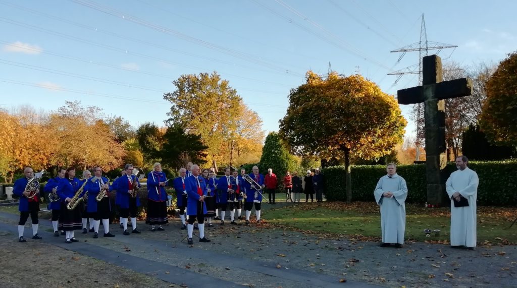 Die Trauerfeier auf dem Friedhof in Hürth-Fischenich am 1. November zum Gedenken an die Verstorbenen, aber auch an die vielen Opfer den beiden Weltkriege beendete das Blasorchester der Fischenicher Blau-Weißen mit dem Lied “Ich hatt einen Kameraden”, Melodie Friedrich Silcher (1789–1860) und Text von Ludwig Uhland (1787–1862. Zahlreiche Angehörige der Verstorbenen, die hier ihre letzte Ruhestätte gefunden haben, gedachten ihrer Lieben bei dieser Feierstunde, die bereits seit vielen Jahren stets am 1. November hier am großen Kreuz mitten auf dem Friedhof stattfindet. Der Ehrenamtliche Beerdigungsbeauftragte Norbert Lotter sprach die Gebete, Pastoralreferent Wigbert Spinrath hielt eine zum Nachdenken anregende Trauerrede und segnete die Gräber. Das Blasorchester, geleitet von Gerd Außem, umrahmte die Feier mit einigen Chorälen.
