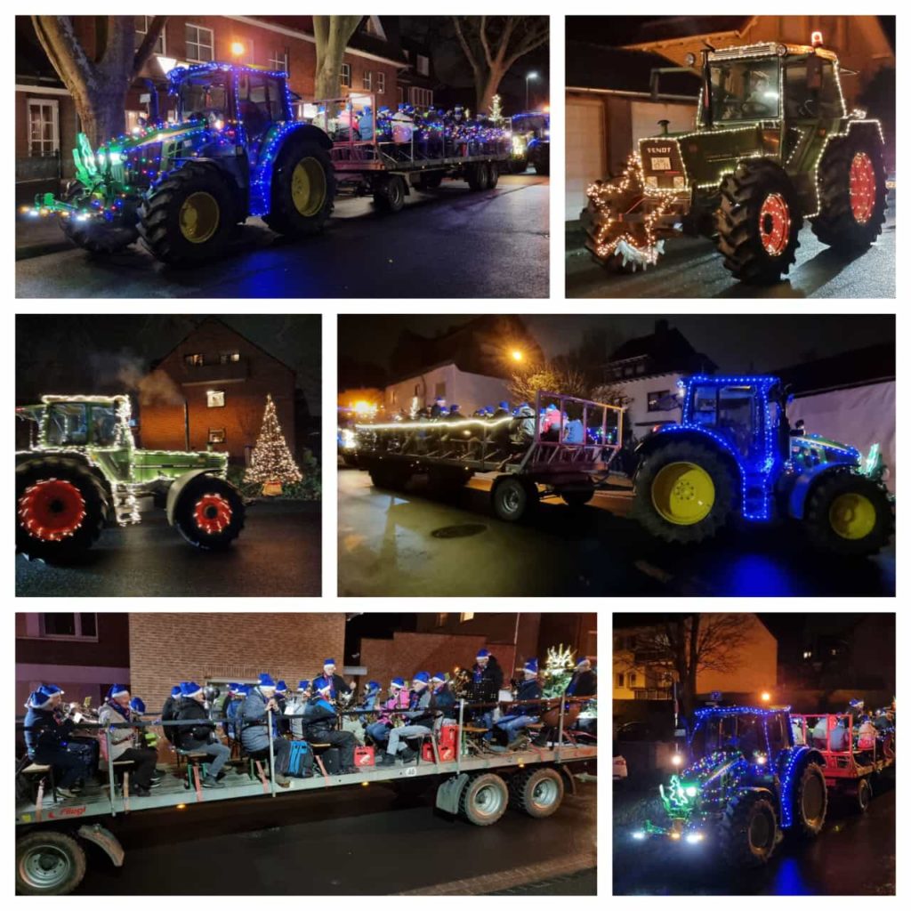 Während die Musikerinnen und Musiker an der Pfarrkirche, dem ersten Haltepunkt, noch stehend musizierten, kletterten sie dann, alle mit blauen (!) Zipfelmützen geschmückt, mit ihren Instrumenten und dem Dirigenten Gerd Außem auf einen großen und festlich beleuchteten Heuwagen. Fleißige Helfer aus den Reihen des Orchesters hatten auf dem Anhänger Bänke, Geländer und Strom für einen E-Baß und sogar eine Lautsprecheranlage aufgebaut oder installiert und alles sicher befestigt. Begleitet von mehreren ebenfalls weihnachtlich beleuchteten Traktoren fuhren sie nun durch Fischenich. Überall an den Haltpunkten fanden sich große und kleine Zuhörer ein, die sich an den weihnachtlichen Klängen und kleinen Präsenten erfreuten.