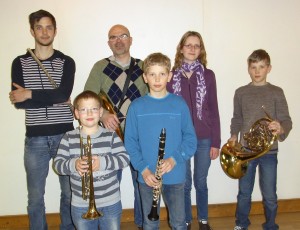 “Von Flöte bis Bass können wir noch alles gebrauchen,” so Jens Böckamp, der mit seinen fünf Schülern (Trompete, Horn, Bariton und zwei Klarinetten) am liebsten modernere Blasmusik macht. So lagen jetzt die Noten “Greensleaves”, “O when the Sains” und “Sunny” auf den Notenpulten.