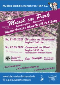 Das diesjährige „Musik im Park“ steht unter dem Motto: „Anderen Menschen Gutes tun, tut gut“ Die gesamten Einnahmen gehen zu gleichen Teilen an das Blasorchester Altenahr e.V., das durch die Flutkatastrophe im letzten Jahr alles verloren hat, und der Hürther Partnerstadt Peremyschljany in der Ukraine.