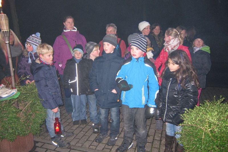 Wir trafen uns um 17:00 Uhr am Rosellenplatz: 25 Kinder mit Eltern, Großeltern, Tante, Onkel… ein paar Herren vom Senat und ein paar weiteren Helfern (Kathrin Außem, Aneta Thomas, Aaron Hertel). Und schon ging es los; mit Fackeln wurde uns der Weg beleuchtet und schnell trafen wir bei der ersten Station ein: Trudi und Johannes Außem waren so lieb und boten uns den ersten Proviant an: Schokolade für die Kleinen und ein Schnäpschen für die Großen.