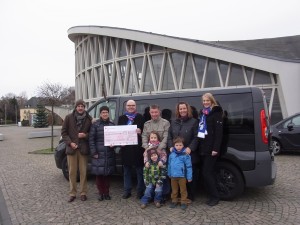 Michael und Angelika Maier von der Initiative “Pänz vun Kölle e.V.” sowie Michael Mehl und Sabine Küster von der KG Blau-Weiß Fischenich überreichten der Familie Kuster aus Erftstadt jetzt vor dem Feierabendhaus zu Knapsack einen Spendenscheck über 6.500 €. Damit und noch weiteren Spenden konnte zur großen Freude von Britta und Dirk Kuster ein behindertengerechter und ausreichend großer Van, ein achtsitziger Opel Vivaro CDTI mit großem Kofferraum, angeschafft werden. Damit sind nun der behinderte Nico (6), sein Zwillingsbruder Luca und Schwester Lara (7) sowie der Rollstuhl und die Eltern gemeinsam mobil.