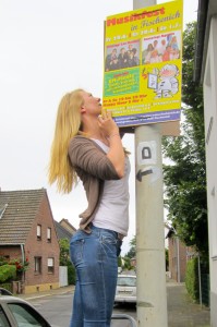 Freiwillige Helfer erklärten sich bereit, bei Wind und Wetter und unter “Einsatz ihres Lebens” die Schilder an den Beleuchtungsmasten der Stadt Hürth anzubringen. Bei einer Mindesthöhe von 2,20m Unterkante hieß das für uns: