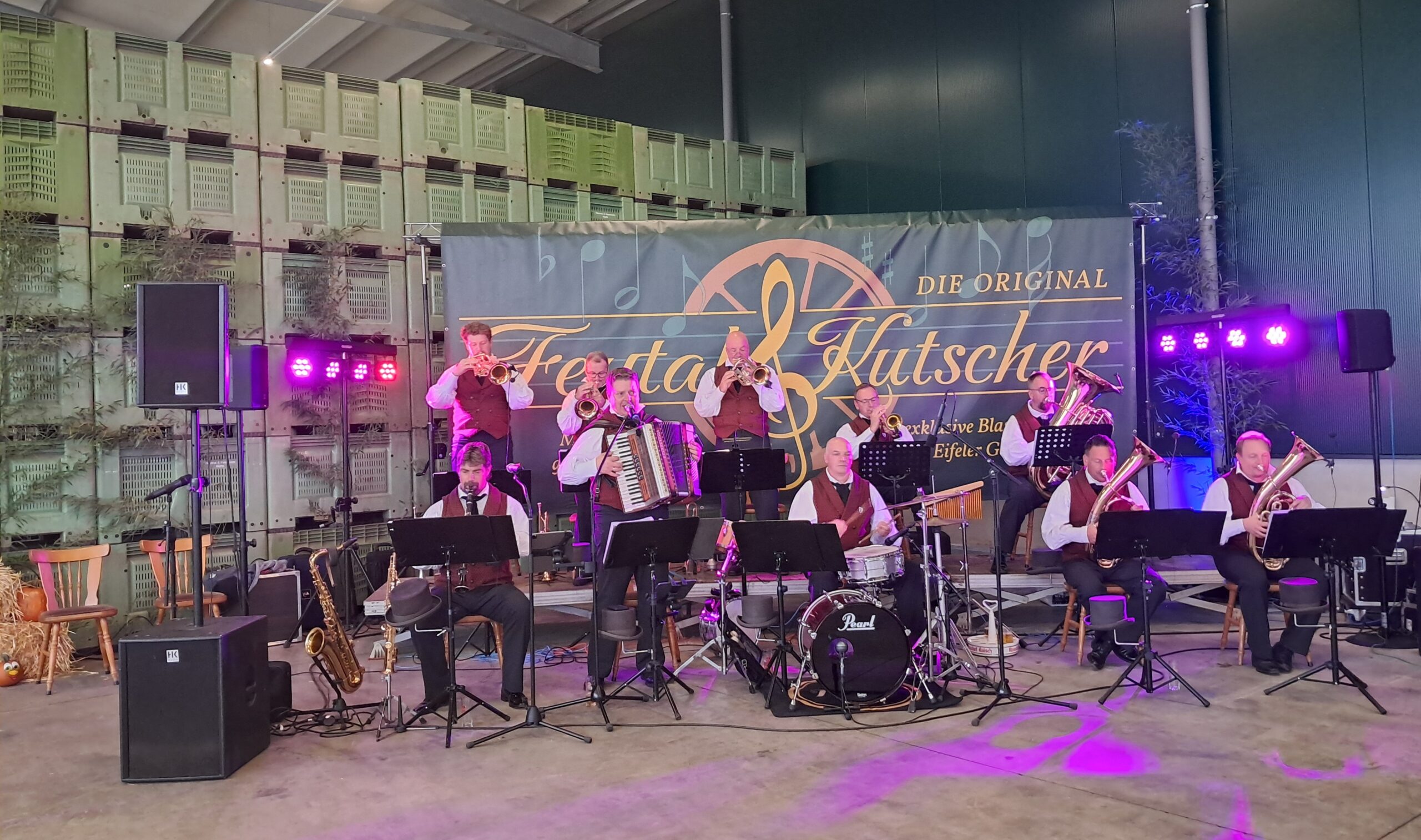 Zum Auftakt marschierte das Blasorchester der KG Blau-Weiß Fischenich, geleitet von Gerd Außem in die Halle und gratulierte musikalisch mit einem Ständchen. Maike Wildfang überreichte Geschenke des Orchesters. Danach spielte die erst 2022 gegründete Blasmusik-Kombo „Feytal Kutscher“ aus der Eifel und begeisterte mit toller Musik. In den dunklen Zeiten der Corona-Pandemie, als die Instrumentalisten zwar nicht gemeinsam spielen durften, aber trotzdem üben mussten, um weiterhin fit am Instrument zu bleiben, hatten sich einige professionelle Musiker mit ambitionierten Amateuren zur Probe und zum Austausch von Kochrezepten getroffen. Um die vorgeschriebenen Abstände beim gemeinsamen Musizieren einzuhalten, trafen sie sich in einer große Halle, in der ein Musiker historische Kutschen aufbewahrte. Es blieb aber nicht beim Essen und Trinken und so entstand die Band „Feytal Kutscher“. Sie machen richtig gute Musik, ganz gleich ob im böhmischen Stil, aber auch Märsche ebenso wie kölsches oder internationales Liedgut. Entertainerqualitäten bewies wieder einmal Saxophonist, Klarinettist und Dudelsackspieler Martin Frings. Die Leitung des Ensembles hat Carsten Ebbinghaus, der beim Musikkorps der Bundeswehr aktiv ist und darüber hinaus auch bei Ernst Hutter und seinen Original Egerländer Musikanten.
