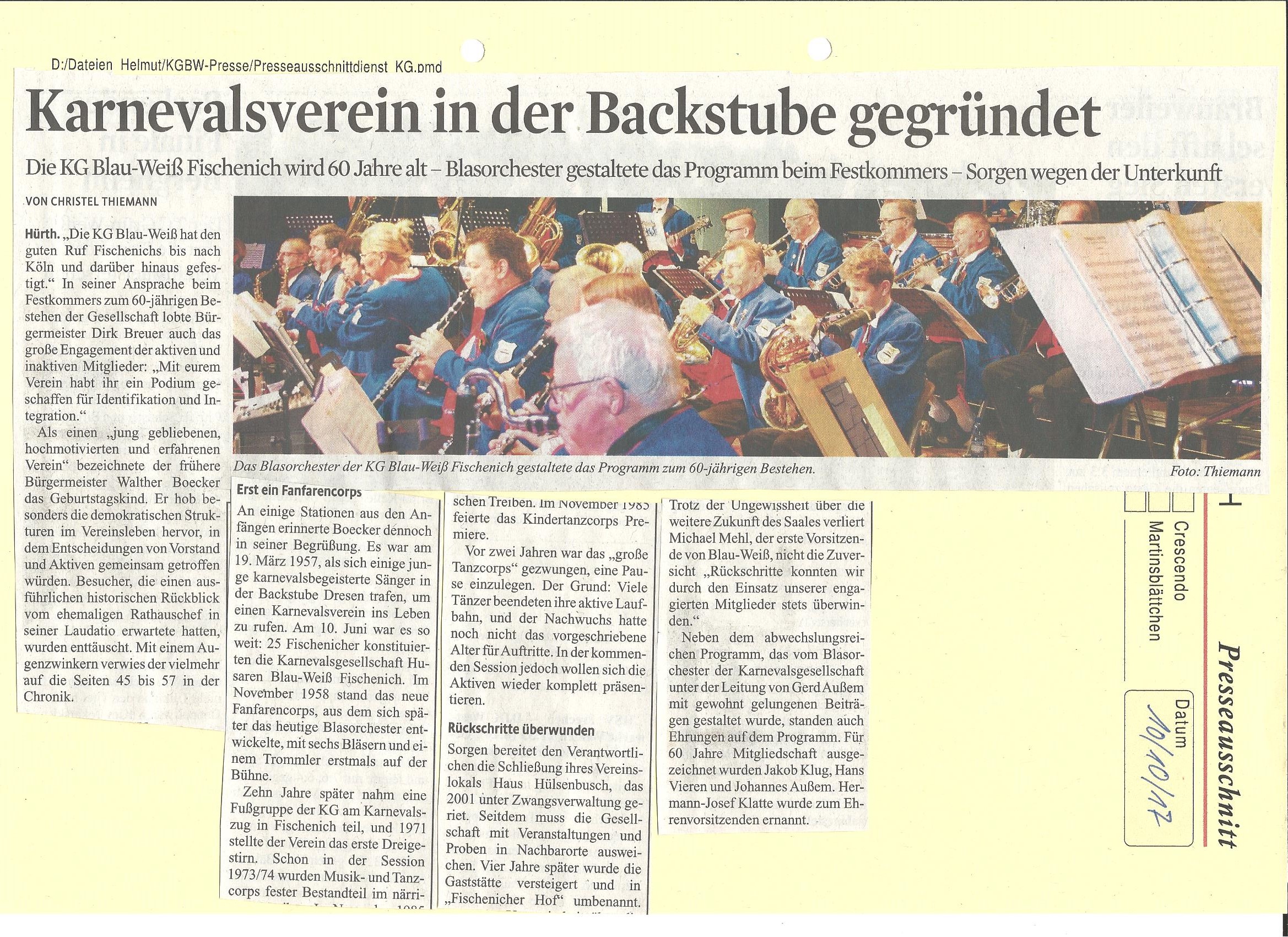 Die Jubiläumsveranstaltungen zu unserem 60-jährigen Vereinsjubiläum begannen am Samstag 7. Oktober im Feierabendhaus Hürth-Knapsack mit einem “Karnevalistischen Benefizkonzert“. Mitwirkende waren das Rednerduo Willi & Ernst, die Kölner Mundartgruppe Räuber sowie das Blasorchester und die Tanzgruppen der KG Blau-Weiß Fischenich. Durch das abwechslungsreiche Programm führte schlagfertig und gut gelaunt Bürgermeister Dirk Breuer.